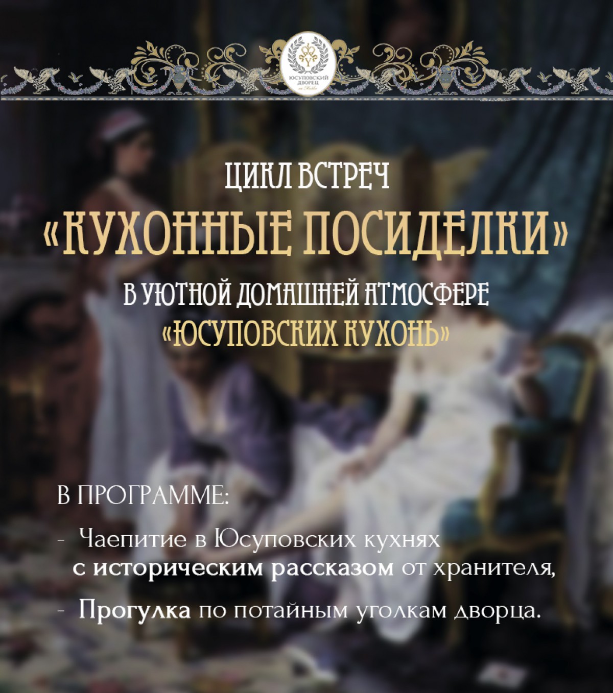 В рамках программы «Женские секреты...» мы открываем цикл встреч «Кухонные посиделки» в уютной, домашней атмосфере «Юсуповских кухонь», который дает возможность приоткрыть секреты частной жизни сиятельных владельцев дворца, пообщаться с хранителем на темы устройства старинного быта, о которых не упоминают в гостиных, увидеть непарадные интерьеры и, обычно скрытую от посторонних глаз, но не менее загадочную и интересную сторону жизни Юсуповского дворца.